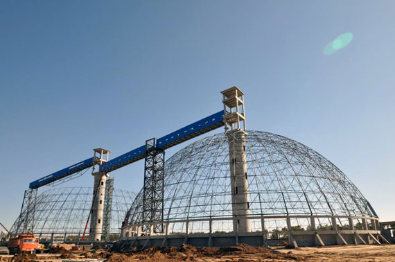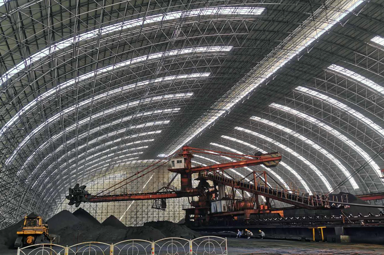 工程内容及規模: 承德承鋼南山一号料棚,跨度78米,長度370米,采用螺栓球網架,高度40米,采用山牆起步,空中散拼。外牆用C型鋼檩條,屋面采用840版型單闆,實現封閉煤棚。