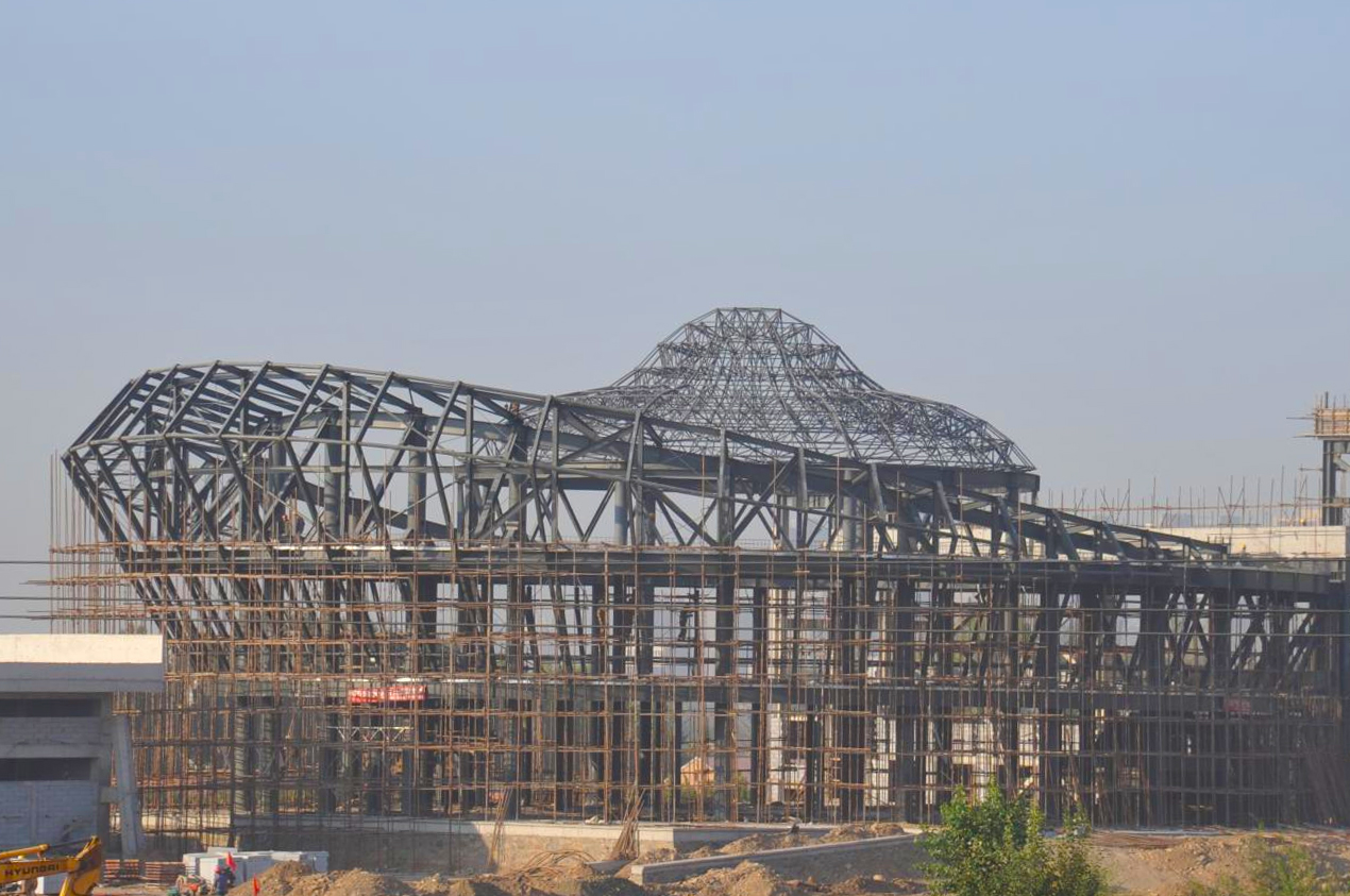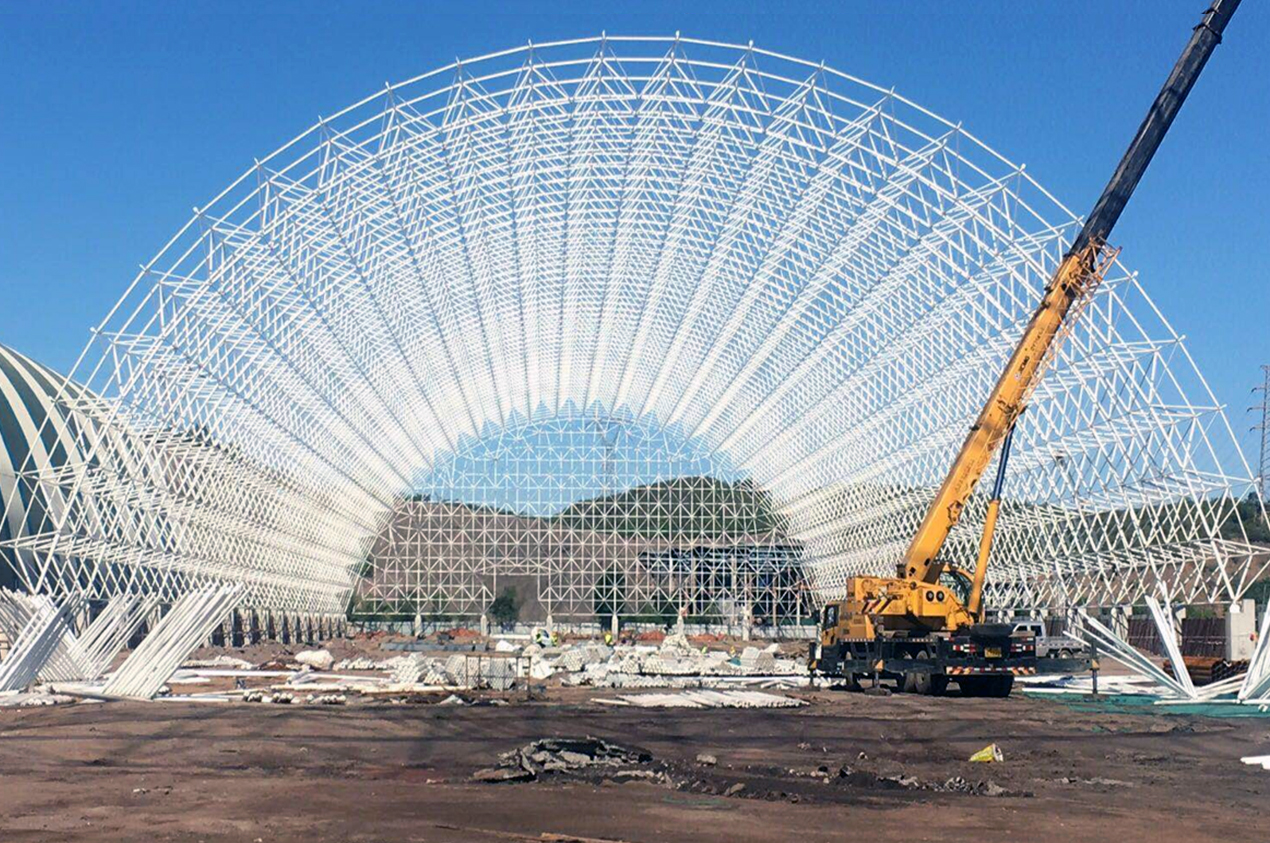 工程内容及規模: 此項目分為格構柱,圓管桁架,屋頂采用螺栓球網架和焊接球網架,格構柱采用現場拼焊制作,二次倒運及安裝,桁架梁工廠運輸做好運輸至工地,網架采用大型履帶吊車進行配套安裝。