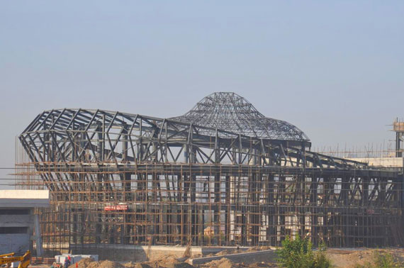 工程内容及規模: 煤炭物流交易中心項目,采用兩個穹頂,一個120米直徑,一個11O直徑,采用螺栓球網架,采用運輸通廊連接起來。作為煤炭交易廊橋。